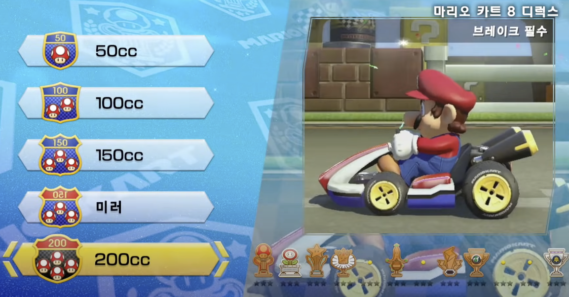 - 그랑프리(Grand Prix): 난이도에 따라 50cc, 100cc, 150cc, 그리고 미러 모드 및 200cc를 선택 가능.